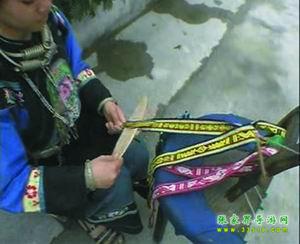 苗家花帶,織花帶,是苗家姑娘最盛行最喜愛的一種習(xí)俗。在苗家,從女兒長到七八歲起,母親就要叫他做針線活,待到十歲左右就交他學(xué)織花帶,如果母親技藝不高,還要請寨子里花帶技術(shù)最高的婦女來教。又得女孩子,從母親或姐姐那里初步學(xué)到織花帶技術(shù)后,就在本寨子邀同齡伙伴,三五個(gè)在一起,互相切磋技藝。待到編制技術(shù)日趨成熟后,姑娘也大了,就往往一個(gè)人躲在房中編制出色鮮艷的花帶,風(fēng)險(xiǎn)少女的情愛。苗家姑娘,往往拿自己編制的花帶作為禮品相贈(zèng),特別是姑娘有了意中人,就吧花帶作為愛情的信物相贈(zèng),以表示以身相許,愛情純貞。