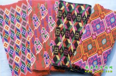 織錦。又名西蘭卡普、土花鋪蓋,為土家族傳統(tǒng)工藝品之一,是森林公園工藝品廠的主要產(chǎn)品??楀\是在特制的本質(zhì)織機(jī)上以錦紗為經(jīng)、五彩絲線為緯、手工提花織成。以其質(zhì)地厚實(shí)、堅(jiān)韌,色彩鮮艷,格調(diào)古樸,流暢生動著稱。圖案有花草、鳥獸、生產(chǎn)、生活、幾何、字樣等種類。為舊時土家姑娘必備嫁妝之一。據(jù)考證,早在漢代,土家織錦就作為方物貢入漢室宮廷。20世紀(jì)后,土家織錦曾漂洋過海至日、美、英等國展出,并作為禮品,被國家領(lǐng)導(dǎo)人贈送給外國元首及政府官員,如今織錦以壁掛、枕巾、沙發(fā)墊、桌圍、提袋、服飾等多種式樣遠(yuǎn)銷世界各地。