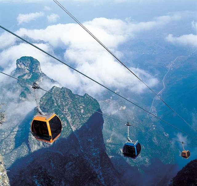 ②、張家界天門山索道為全世界最長的觀光客運索道,索道線路斜長7455 米,索道運行速度為每秒 6 米,單程運行時間約28分鐘。上、下站水平高差1279米主要設(shè)備均由法國POMA公司原裝進口,索道鋼繩來自于法國, 98 個吊廂來自瑞士 CWA 公司,單個造價高達 20 萬元人民幣。有嚴重心臟病或恐高癥等患者不建議乘坐;