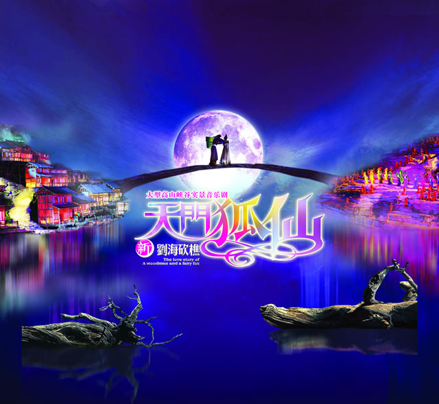 《天門狐仙——新劉海砍樵》目前是世界第一臺有完整故事情節(jié)的山水實景音樂歌舞劇。舞臺選址在天門山風(fēng)景區(qū)山門口內(nèi)至天門山頂?shù)恼麠l峽谷,總投資達到1.2億元,演員隊伍達530多人。主舞臺以10000平米的玻璃鋼打造,是目前世界最大的全景玻璃鋼舞臺。音樂主創(chuàng):譚盾。
