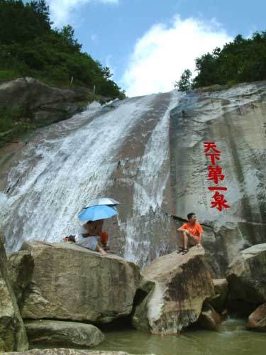 水簾瀑布源頭,在紫蓋峰的泉水。三支泉水匯集一起,流入水簾上方谷地。谷地闊三丈,原是梁朝的九位真人白日飛升的棲息之地,后建造九仙觀。九仙觀附近有太陽(yáng)泉、洗心泉、真源、仙人池等。相傳泉水深不可測(cè)。泉水從石壁上飛流直瀉,發(fā)出雷鳴般的聲音,聲傳十里。明朝張居正游此地后說(shuō):“瀑泉灑落,水簾數(shù)疊,掛于云際,垂如貫珠,霏如削玉”。確實(shí),它從絕壁上噴瀉下來(lái),寬達(dá)三太,高五十余米,瀉珠濺玉,仿佛一幅巨大的白布簾,在石壁當(dāng)中被亂石嶙巖擋住,然后再?gòu)氖p里屈曲折射,跳躍出來(lái),滿谷水花四濺,閃爍著晶瑩奪目的光彩。水簾絕壁下的碧潭,天上的云彩和兩邊的蒼翠的山巒,構(gòu)成一幅美麗的山水畫。明朝張居正作《水簾》一贊道:“誤疑瀛海翻瓊浪,莫擬銀河倒碧流;自是湘妃深隱處,水晶簾掛五去頭”。這首詩(shī)可說(shuō)是寫出了水簾的光、聲、影三絕的奇景了。