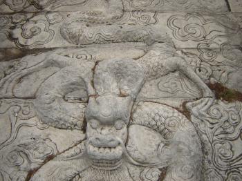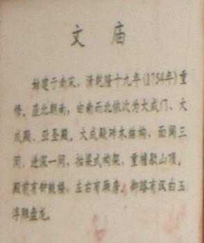 廟前面有學宮坪,亦名學坪,坪南端有大明壁。廟宇紅墻黃瓦,氣勢宏偉。正門曰奎星門,前院左右各植檜樹,常年翠綠,散發(fā)幽香??情T內有月形泮池,池周護以石欄。泮池附近有石坊三座,正南石坊匾額鐫有“斯文在茲”四字,東西兩坊貫通街衢。通過石坊便是大成門。進門左右是飛檐綠瓦的鐘鼓亭。大成門通向大成殿,有石鋪甬道直抵大殿臺基。臺高一米,全系石塊疊成。臺階分左右兩道,中有石雕盤龍,綴以云海波濤,栩栩如生,躍然石上。大成殿為歇山式重檐結構,周圍有16根圓石柱,內外枋、檁、藻井、斗拱、扇梧均五彩施繪,黃瓦飛檐,蔚為壯觀。殿后有亞圣殿,與大成門、奎星門前后襯應,更顯出大成殿主體的雄偉。