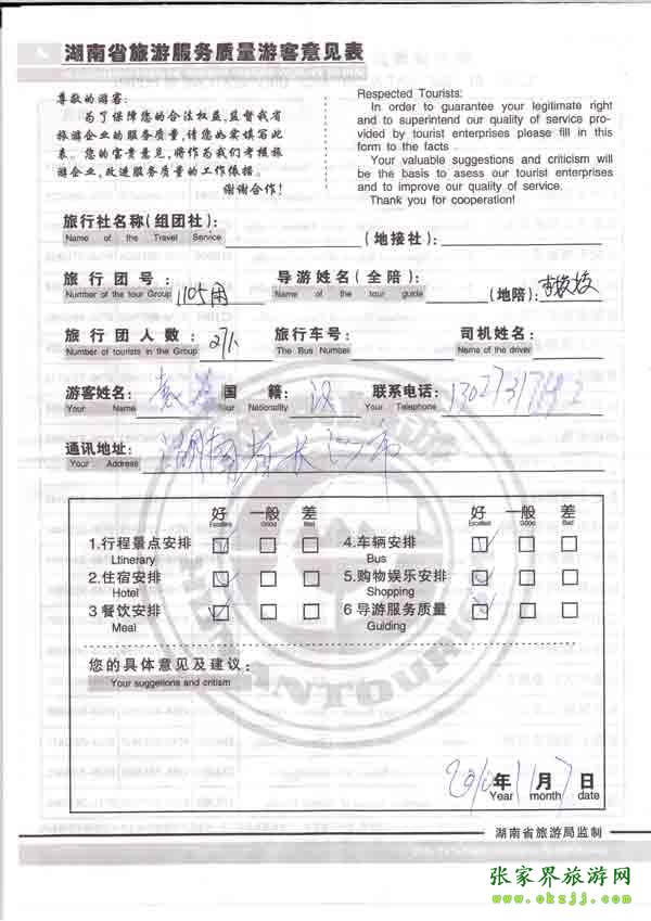 2010年11月7日長沙袁先生一行27位旅游質量反饋