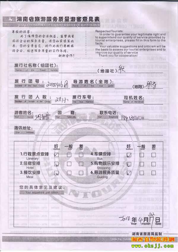 2010年4月22日鞏小姐一行2位旅游質量反饋