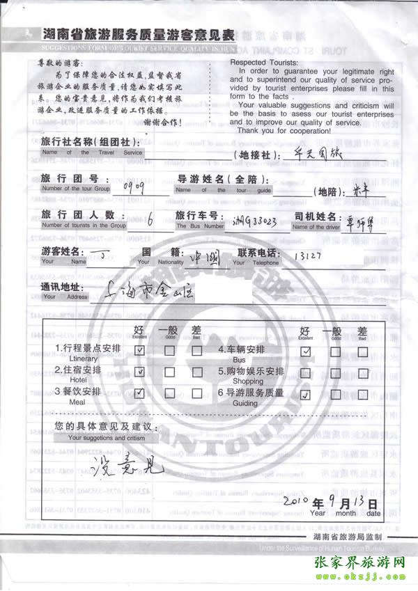 2010年9月9日上海丁先生/女士 給米豐導(dǎo)游好評(píng)