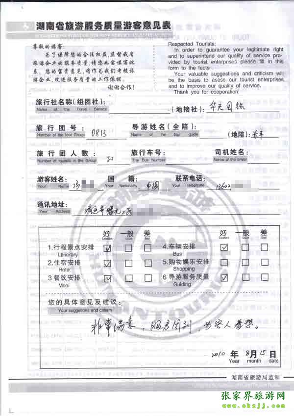 2010年8月15日清遠馮先生一行20位旅游質量反饋:非常滿意,服務周到,為人著想