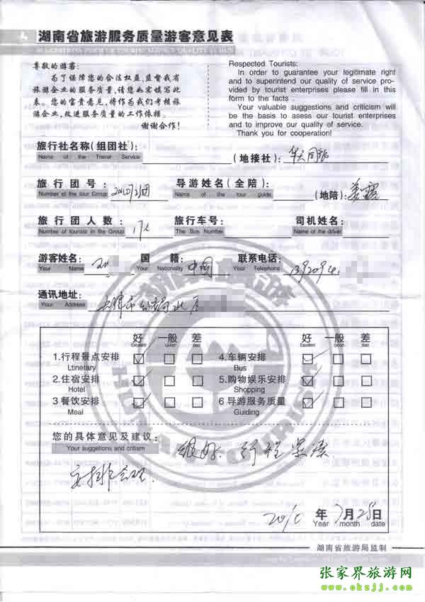 2010年7月29日天津王先生一行17位旅游質(zhì)量反饋
