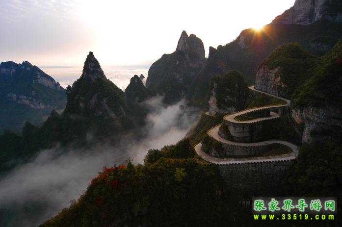 通天大道與天門山索道、天門開、空中花園并稱天門山四大奇觀,它共有九十九道灣,在索道上俯看如巨龍騰起,如玉帶盤纏,直通天際,使人為之震撼,堪稱天下第一公路奇觀。由此可直抵天門下天梯前。