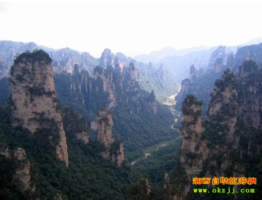 早上9點在路邊等旅游車(山上的車費包括在門票中),路邊已經站著很多住山上的自助游的游人,我們等了15分鐘才上車,大約20分鐘后在神堂灣下車,一個極具神秘色彩的地方,相傳明朝初土家族的一個古代首領向王天子兵敗受困于神堂灣,終支持不住整支軍隊跳崖自殺,每當陰雨天或者天氣突變的時候,就能隱約聽到崖底人喊馬嘶的聲音……離神堂灣不遠的地方是點將臺,下面的四十八將軍巖栩栩如生,就像一個個整裝待發(fā)的將兵。接著我們走到賀龍公園,旅行團去的地方,可想而知,到處是人,韓國人居多,這兩天見到的韓國人比中國人多,景區(qū)的韓國文字到處可見,連小販都能用韓語招攬生意,可見張家界在韓國的宣傳力度之強。這的景色一般,撥開人群,看看仙女散花和御筆峰,走人。中飯就在不遠處的小餐館里解決。 飯后快12點了,向導帶我們去的是天子山的精華景點大觀臺,入口在公路旁邊,沒任何標志,如果沒有向導,很難發(fā)現這里進去是個絕佳的景點。去那的人極少,可以很清凈地觀賞美景。坐了一會的旅游車,就到了大觀臺的路口,我們沿著路走進去,看到大觀臺的牌子,有三個年輕人在路邊休息,我們開始下石梯,剛好有對中年夫妻已經上來了,他們都是早上下去游玩的,看他們氣喘吁吁的樣子就知道下面的行程有多累。之后我們六人再也沒遇上任何游人。走了無數階梯和平板路,看見上鎖的廁所、關閉的商鋪和地上無人清理的樹枝就知道這里真是很少有人來。 我們先到仙人橋,一座比天下第一橋更加險峻的窄石橋,石橋前圍著鐵絲提醒游人這里危險!長10多米,寬不過1米的天然石橋,下面是350米深的山谷,兩旁四面皆無護欄,走在上面如果一不小心就會做自由落體運動。接著是天子座,四周有圍欄,左右兩邊都是空曠的山谷,這里的景色也很美。第三個景點是一步難行,兩座山之間,是一米多的距離,下面是深淵,如果一步不夠大,就摔下去了,據說從前曾經有幾個人從這里掉下去,之后再沒人敢過去,后來修了鐵橋,不過走在鐵橋上,我還是感覺腳下涼颼颼的有些害怕。最后一個景點是神雞啄食,這里可以遠眺干枯的十里畫廊。 回程的路上,兩旁樹叢中不斷有細細簌簌的聲音,估計是小鳥、松鼠之類的小動物,走著走著又聽見聲音,回頭看看,輕輕對我說:“蛇” 我回頭撇了一眼,看不是很清楚,象蛇的形狀,“啊”的一聲我們倆迅速沖向前面,以前還不知道自己原來可以跑得這么快,還好蛇沒跟上來,呵呵,之后向導就和我們聊起關于山中蛇的話題?;厝ロ斨胰詹粩嗟嘏离A梯,好累!雖然累,對這兩天走的景點非常滿意,沒有讓我們失望。到路邊等車時已經下午3點了,我們在大觀臺走了三個小時,也暴曬了三個小時,回到住處時發(fā)現臉上都曬得脫皮了,嗚嗚!今天太累了,回去就倒頭大睡起來。
