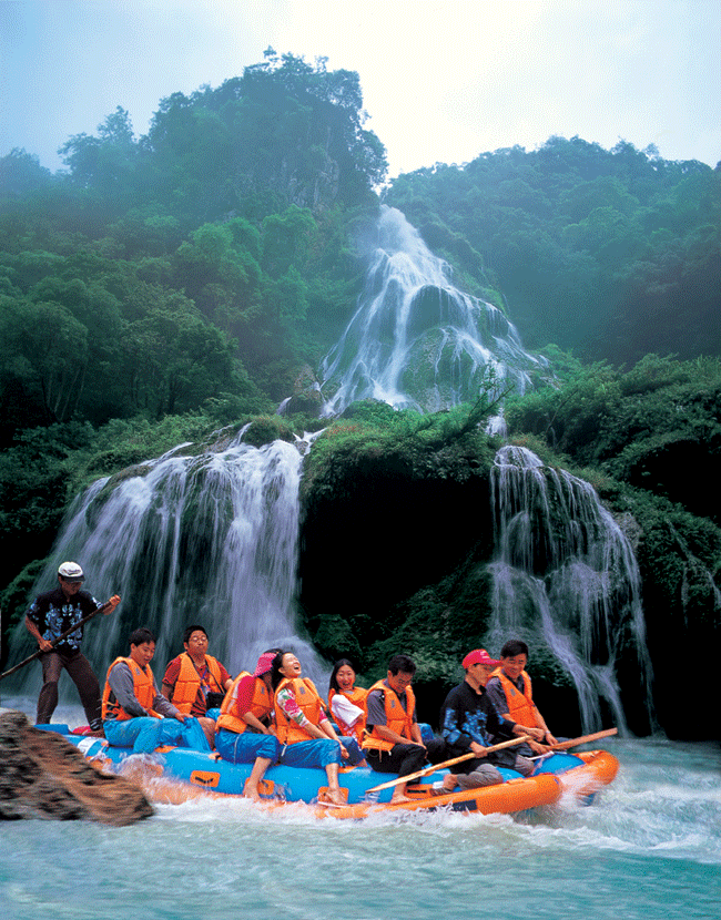 第四天,清晨我們便踏上了汽車去看漂流。號(hào)稱亞洲第一大的九天果然是名不虛傳,我們把它現(xiàn)在開發(fā)的部分粗略的走了一下,就花了我們近月4個(gè)小時(shí),中鐘乳石遍地,在五彩斑闌的燈光下,顯得晶瑩剔透,閃閃發(fā)光,讓人感覺到是到了水晶宮一般,地下還有陰河,遠(yuǎn)處通知海(據(jù)說)。對(duì)了,中溫度很低,常年在10多度。讓人在其中感覺到一陣陣寒意。故想進(jìn)去的朋友記得多穿點(diǎn)衣服,以免著涼,切記。我們當(dāng)時(shí)就是吃了很大的虧,從中出來時(shí),小嵐就在點(diǎn)喀漱。下午來到茅巖河漂流。上船前看到有人賣水瓢,心中不免奇怪。雖說,張家界金鞭溪的水可以喝,但也不是每一條河的水都能喝???于是上前去問,一打聽才知道,這瓢不是用來舀水喝的,而是用來打水仗的。本來因?yàn)樾褂悬c(diǎn)小感冒,我們打算保持中立,但一看到各位船友們個(gè)個(gè)磨拳擦掌,人手一把瓢或者水槍(這是當(dāng)?shù)厝擞弥褡幼龅囊环N土水槍),還且對(duì)我們是虎視眈眈,我想我參加是不成了。于是我們也花了幾塊錢買了兩把。船開動(dòng)后,大家開始時(shí)還是比較興奮,不時(shí)用瓢來劃一下船,但是沒多久,大家就開始尋找新的開心方式了,于是大家都開始蠢蠢欲動(dòng)了,大家也都不客氣,不管別人是否作好應(yīng)戰(zhàn)準(zhǔn)備,反正是先下手為強(qiáng),其中一條船首先開火,于是大家都沒有在乎什么了,見著在自己的攻擊范圍內(nèi)的非本船的人員都拿來作為自己的攻擊目標(biāo)。于是一時(shí)峰煙四起,水花四濺,幾乎看不清別人了,反正是嘴不能張,不然很容易被別人灌進(jìn)水去。每條船都選了一名成員為隊(duì)長,我們這組的一位北京的朋友自告奮勇的成為了我們的隊(duì)長。于是大家都聽他的指揮。大家同舟共濟(jì),萬眾一心。雖說不時(shí)遭到攻擊,但是大家都有happy得不行。一時(shí)休戰(zhàn),再經(jīng)過幾個(gè)灘后,大家再戰(zhàn)。這次,大家不再是沒有目的的攻擊,幾個(gè)隊(duì)長經(jīng)過商量后,大家結(jié)成聯(lián)盟,一起對(duì)付那條仗著自己全是男子漢的最猛的船。。。。。。結(jié)果是將那條船上的兩個(gè)“猛男”給潑到船下去了。不過船是橡皮做的,有驚無險(xiǎn)。結(jié)果是到了終點(diǎn)后,每個(gè)人都成了水人。不過大家都happy的不得了。下午,漂流公司的車送我們到市內(nèi)。不幸的是,小嵐因上午著涼,下午又淋水,結(jié)果感冒了。彭導(dǎo)是早已等到汽車站了。我們又去吃了點(diǎn)東西。